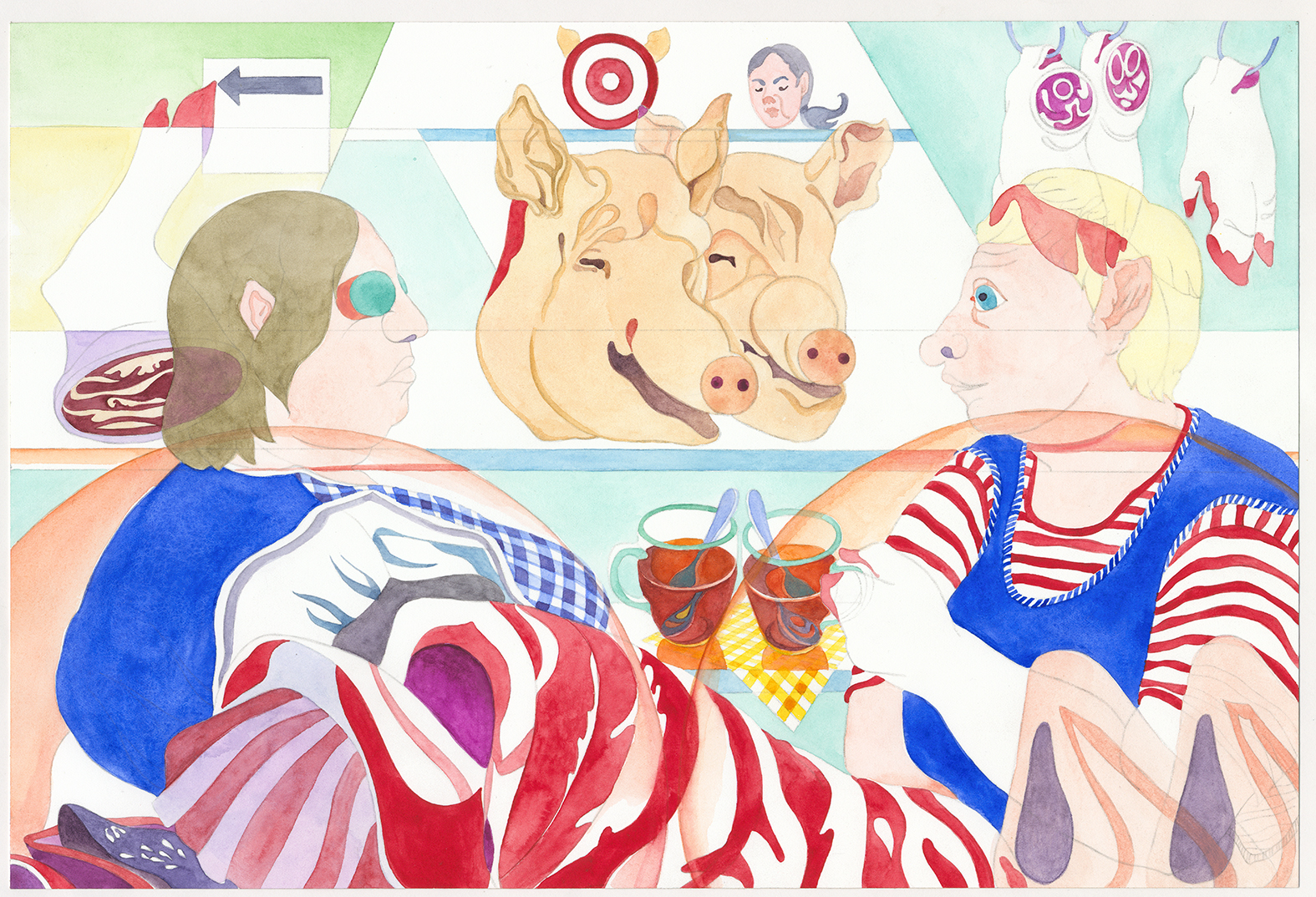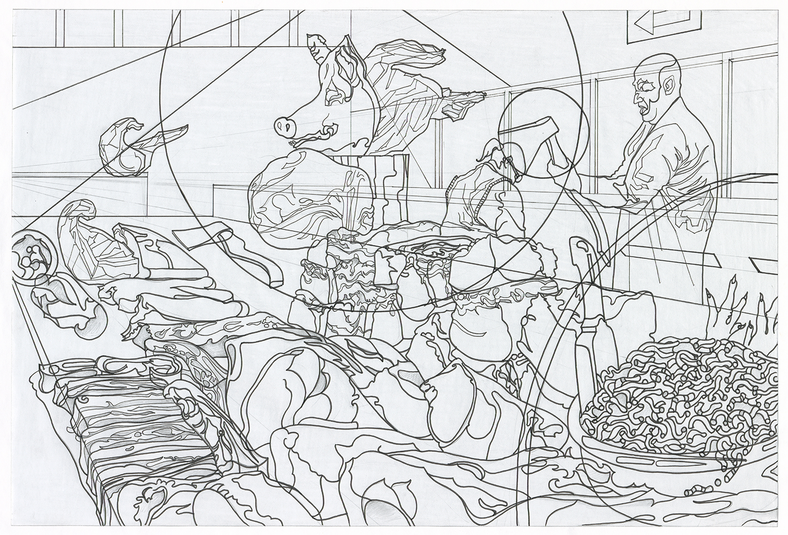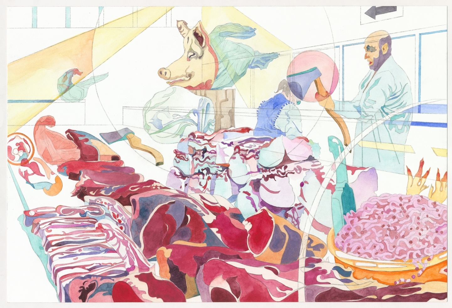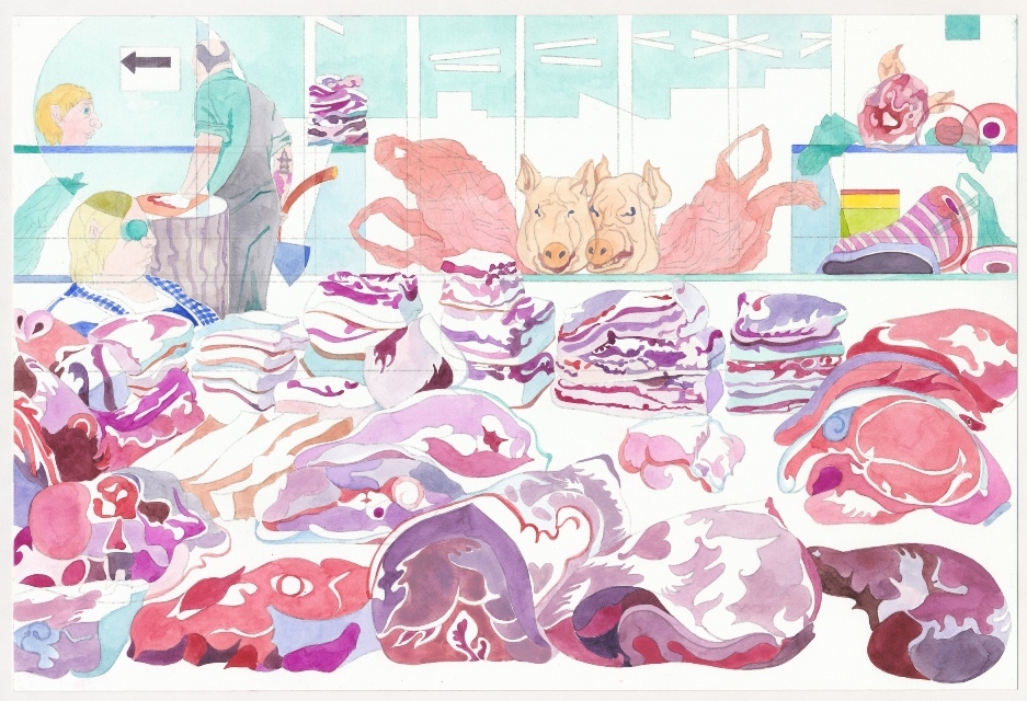 Продавцы вместе с покупателями обретают черты, намекающие на принадлежность к миру поедаемых животных, - у кого-то причёска напоминает куриный гребешок, у кого-то рука – свиное копытце. В то же время, на мясном прилавке можно увидеть носы и уши, очень напоминающие фрагменты органов чувств человека. Таким образом, происходит момент единения человека с миром животных, как существ с душой, наделённых в целом общими качествами, способными чувствовать и страдать.
