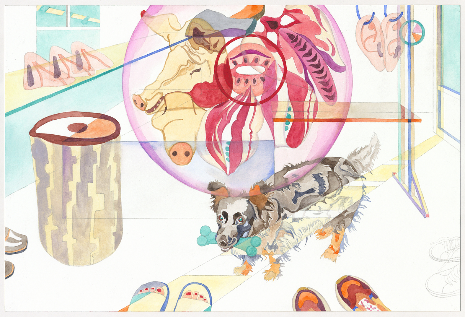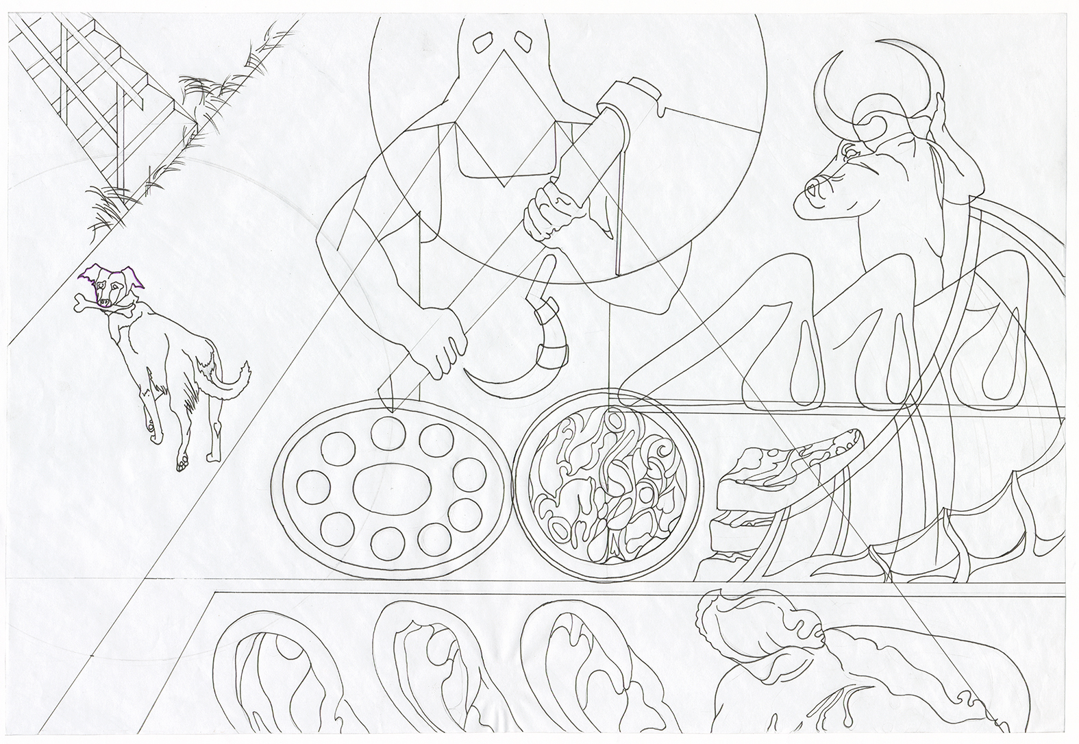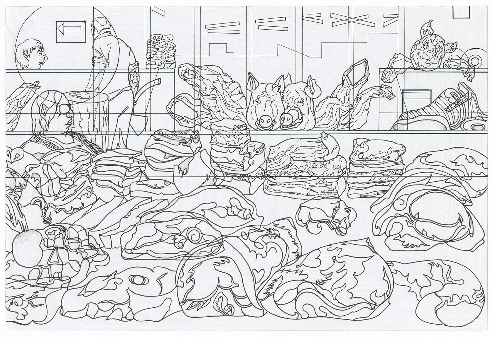 Продавцы вместе с покупателями обретают черты, намекающие на принадлежность к миру поедаемых животных, - у кого-то причёска напоминает куриный гребешок, у кого-то рука – свиное копытце. В то же время, на мясном прилавке можно увидеть носы и уши, очень напоминающие фрагменты органов чувств человека. Таким образом, происходит момент единения человека с миром животных, как существ с душой, наделённых в целом общими качествами, способными чувствовать и страдать.