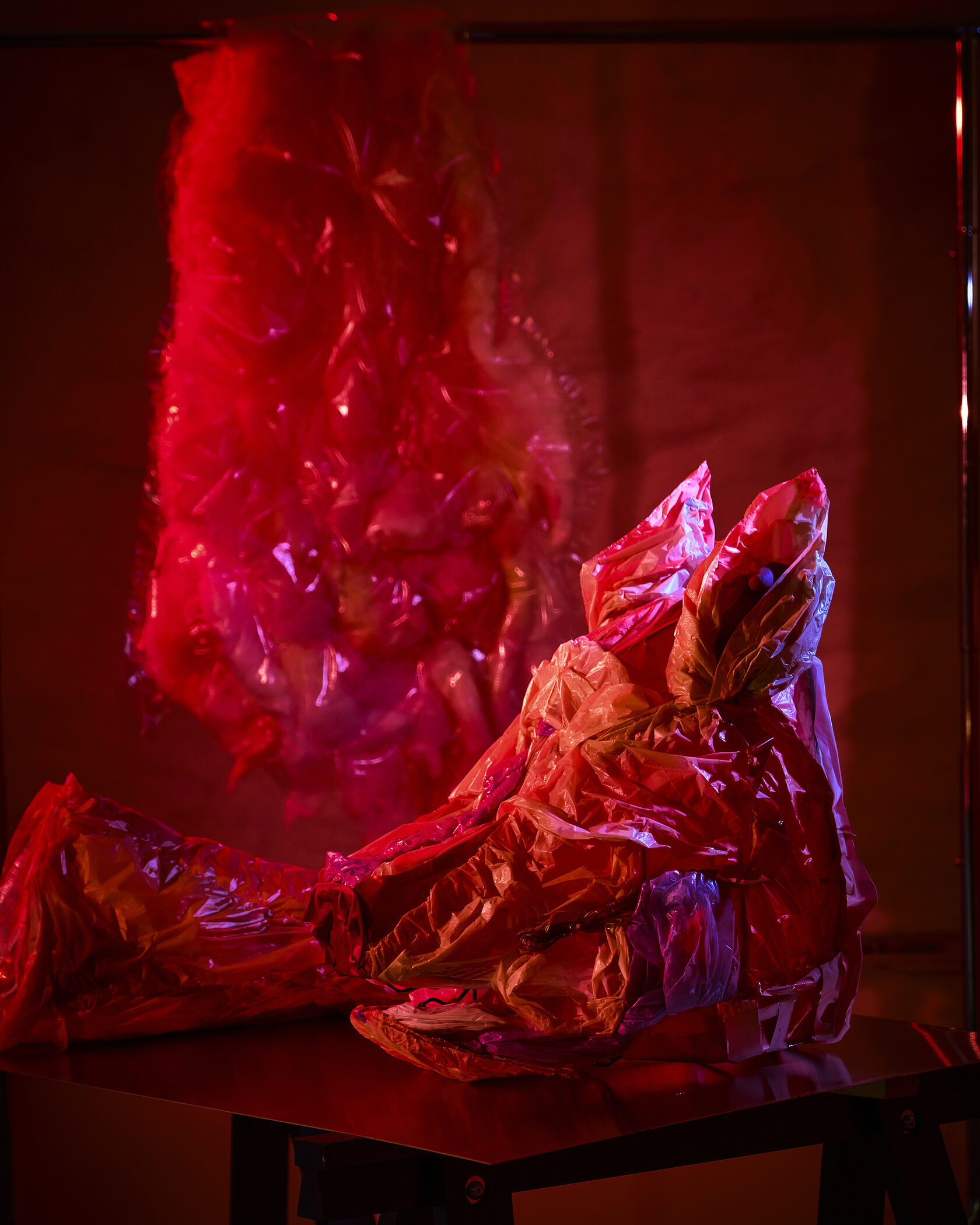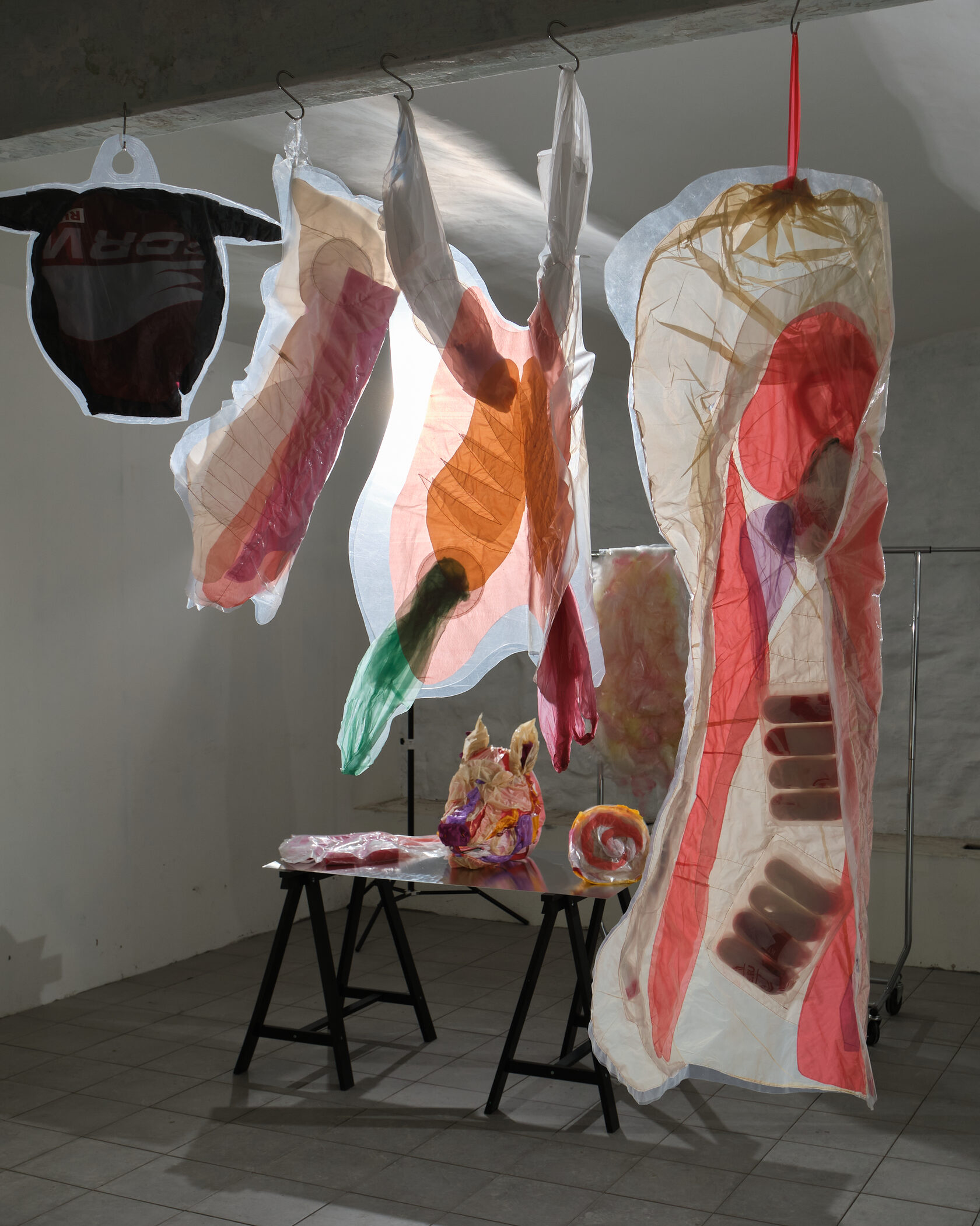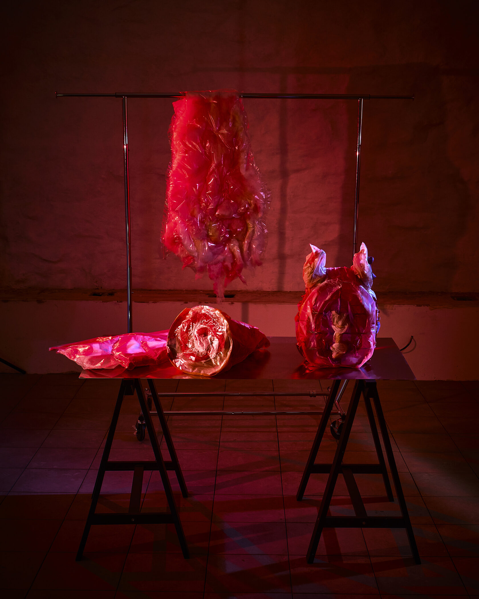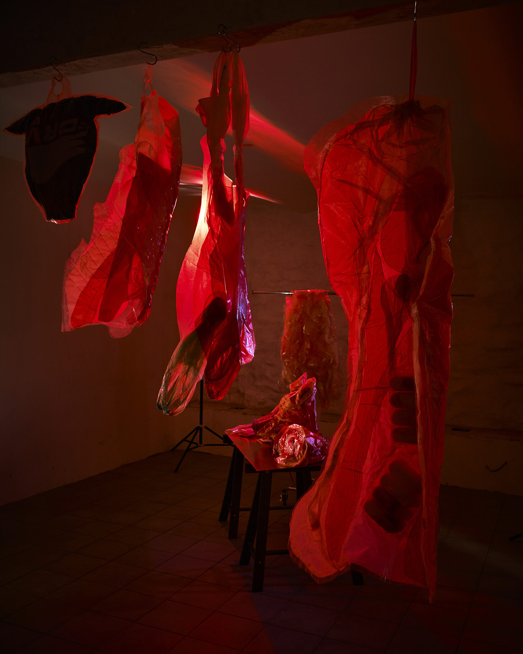 Полиэтиленовые пакеты стали основным материалом объектов моего проекта. Из них выполнены мясные туши и головы, а также мощевик — богато декорированная шкатулка для хранения мощей святых, символизирующего забытые традиции. Собранные вместе, эти объекты образуют инсталляцию, схожую со ступенчатыми прилавками-жертвенниками. Таким образом, пластиковая упаковка, которая должна абстрагировать покупателя от «изнанки» мясного производства, а значит и от реальности, сама становится этой реальностью.