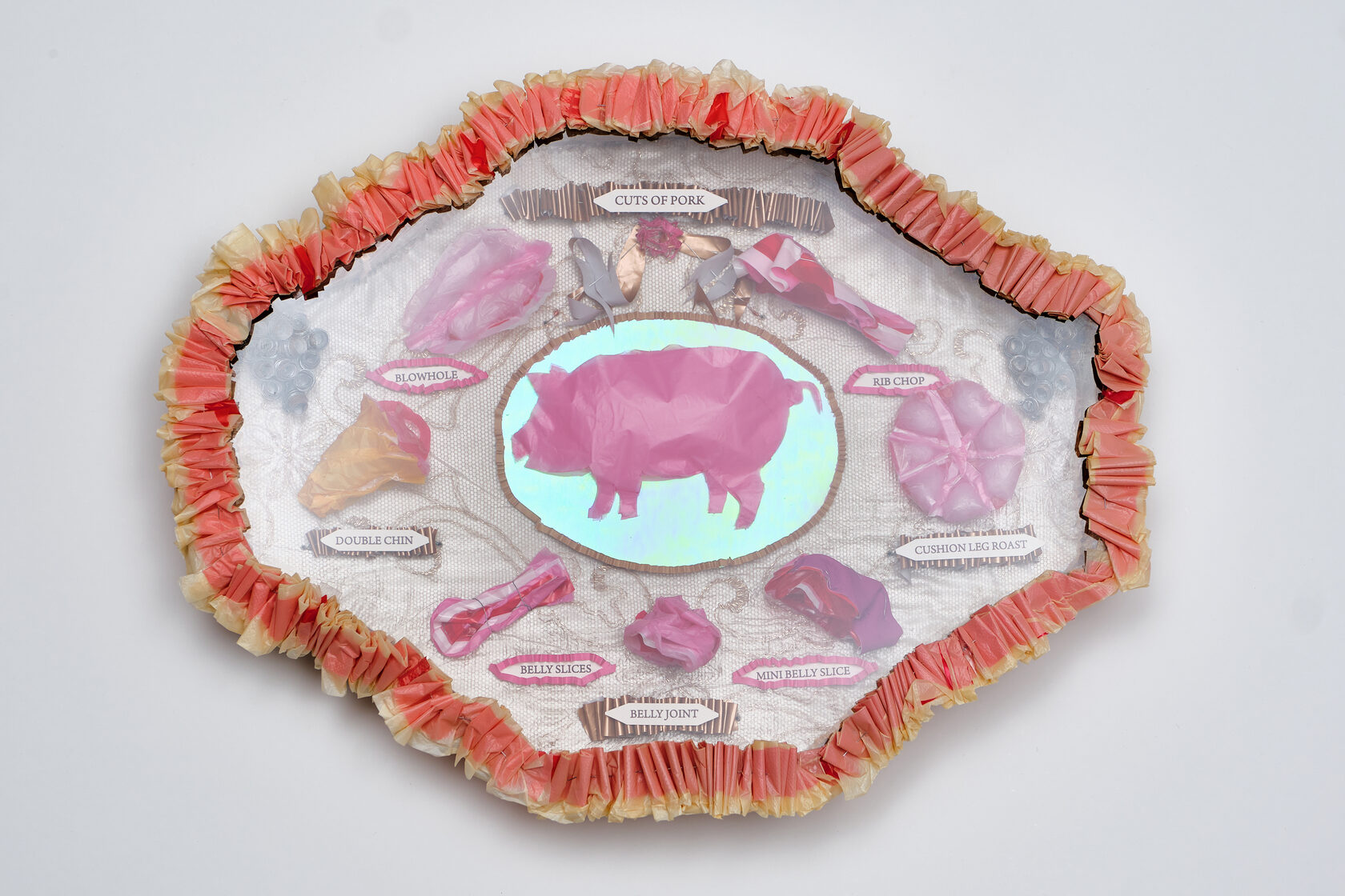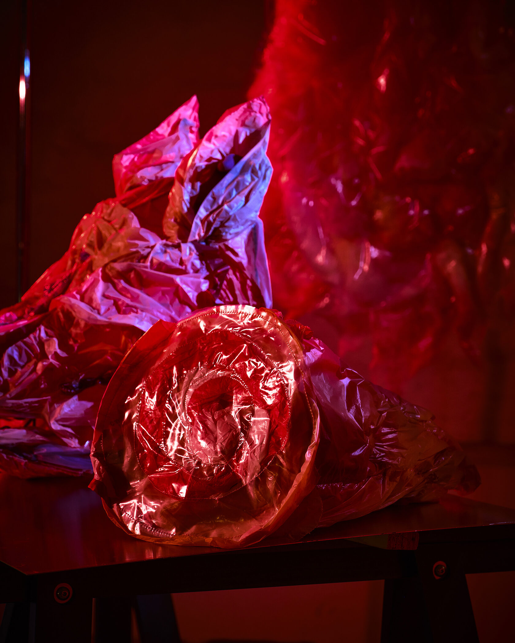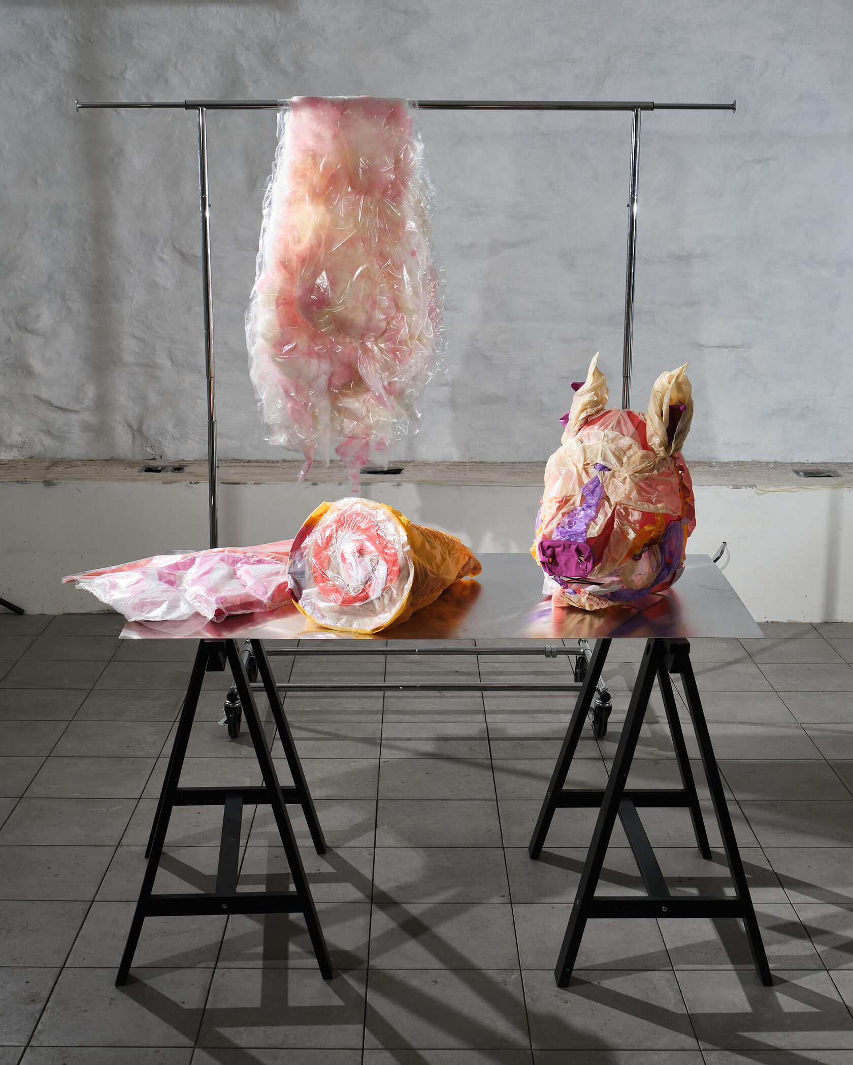 Полиэтиленовые пакеты стали основным материалом объектов моего проекта. Из них выполнены мясные туши и головы, а также мощевик — богато декорированная шкатулка для хранения мощей святых, символизирующего забытые традиции. Собранные вместе, эти объекты образуют инсталляцию, схожую со ступенчатыми прилавками-жертвенниками. Таким образом, пластиковая упаковка, которая должна абстрагировать покупателя от «изнанки» мясного производства, а значит и от реальности, сама становится этой реальностью.