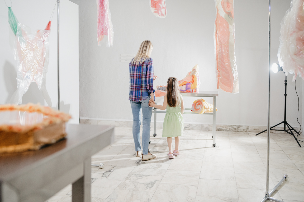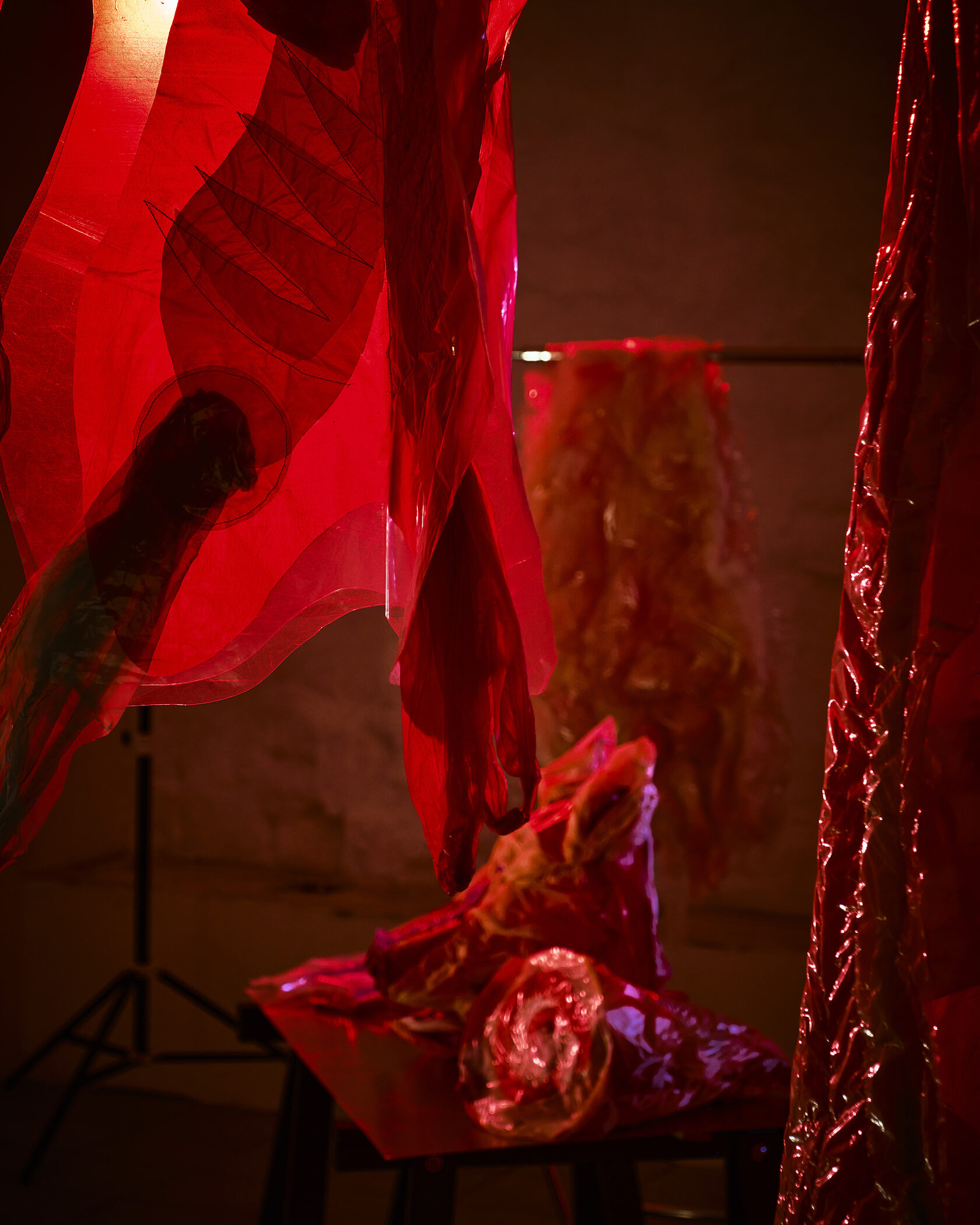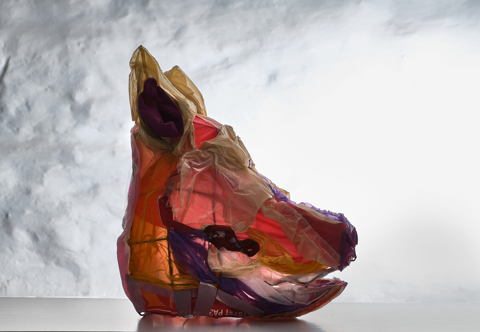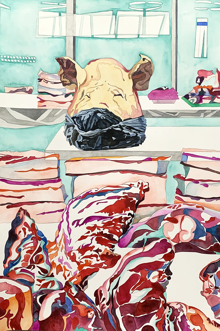 Полиэтиленовые пакеты стали основным материалом объектов моего проекта. Из них выполнены мясные туши и головы, а также мощевик — богато декорированная шкатулка для хранения мощей святых, символизирующего забытые традиции. Собранные вместе, эти объекты образуют инсталляцию, схожую со ступенчатыми прилавками-жертвенниками. Таким образом, пластиковая упаковка, которая должна абстрагировать покупателя от «изнанки» мясного производства, а значит и от реальности, сама становится этой реальностью.