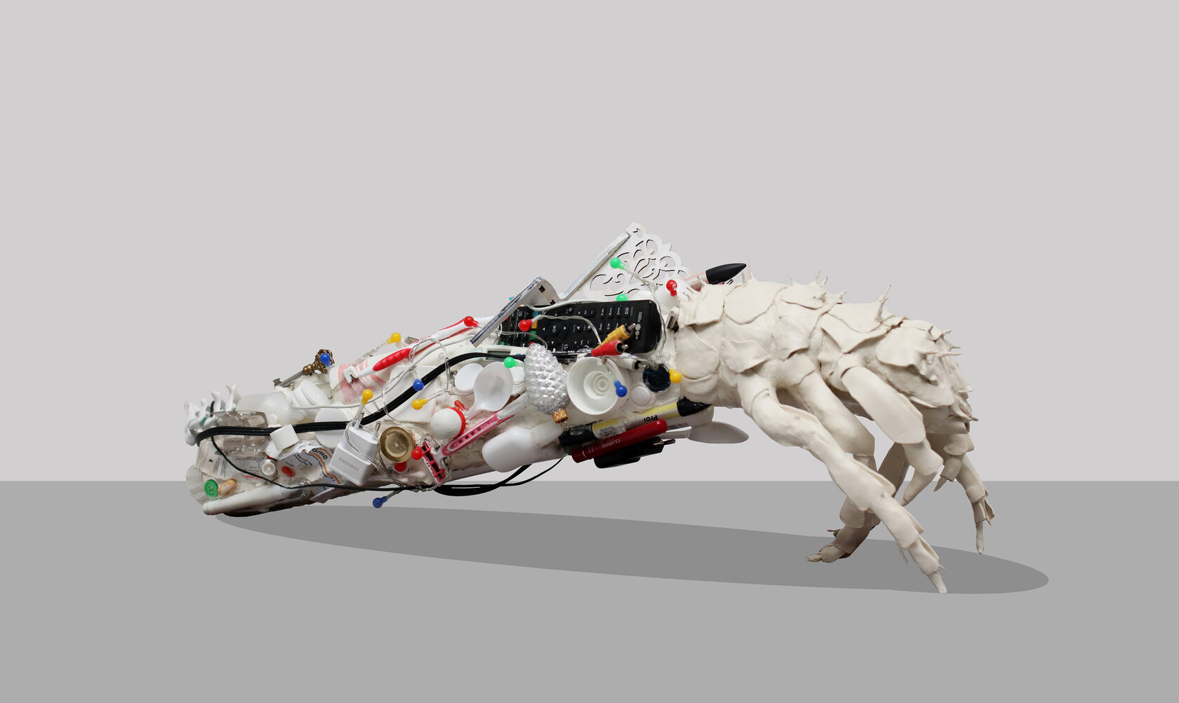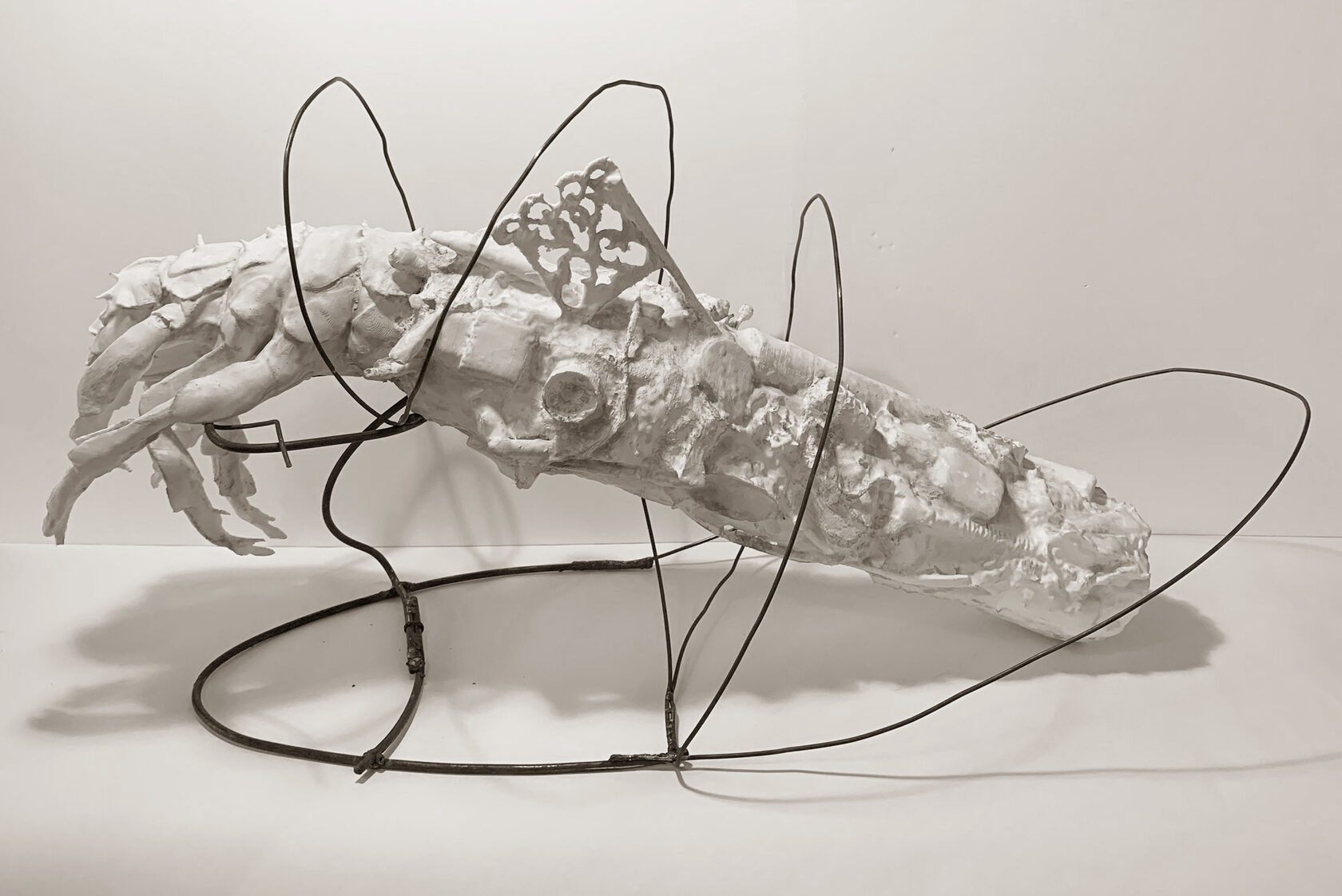 «Ручейник», скульптура, 3D печать, металлический каркас, 47 х 29 х 90 см, 2023 г.