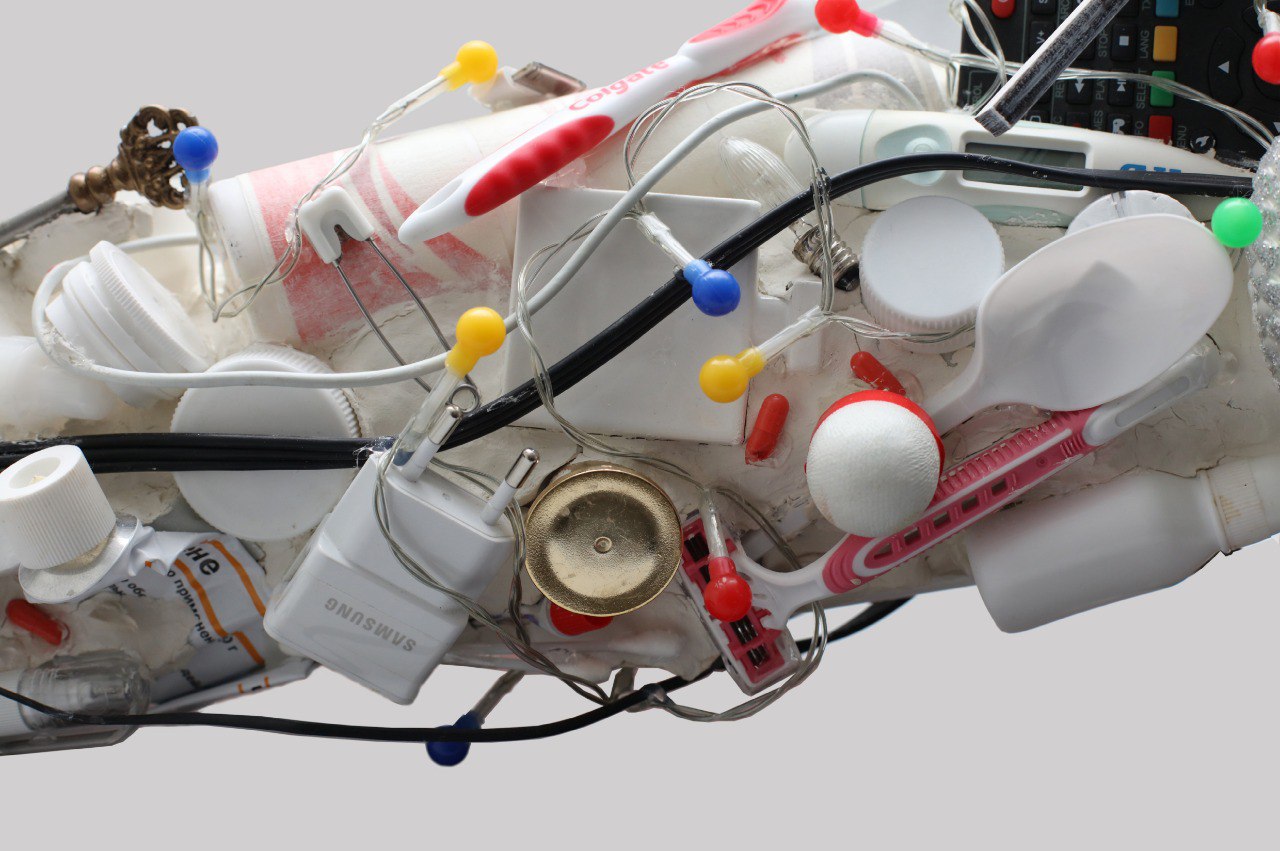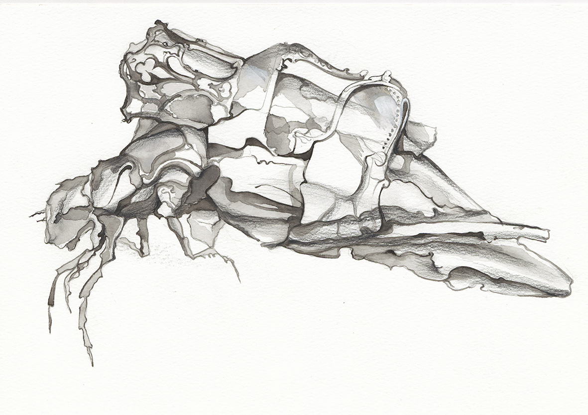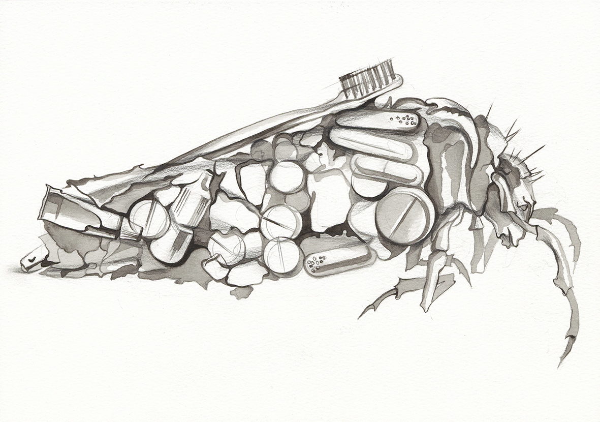 Как привычки в состоянии тревоги обретают гипертрофированный масштаб, так и свидетельства нашего бытования превращаются в моём проекте в музейные артефакты. «Ручейник» состоит из двух блоков работ – скульптуры и рельефной шелкографии, где я создаю ситуацию «до» и «после». «До» - это жизнь личинки Trichoptera в футляре из предметов в привычном для нас виде. «После» - монохромные окаменелости, то, что станет археологическими признаками нашей цивилизации в будущем.